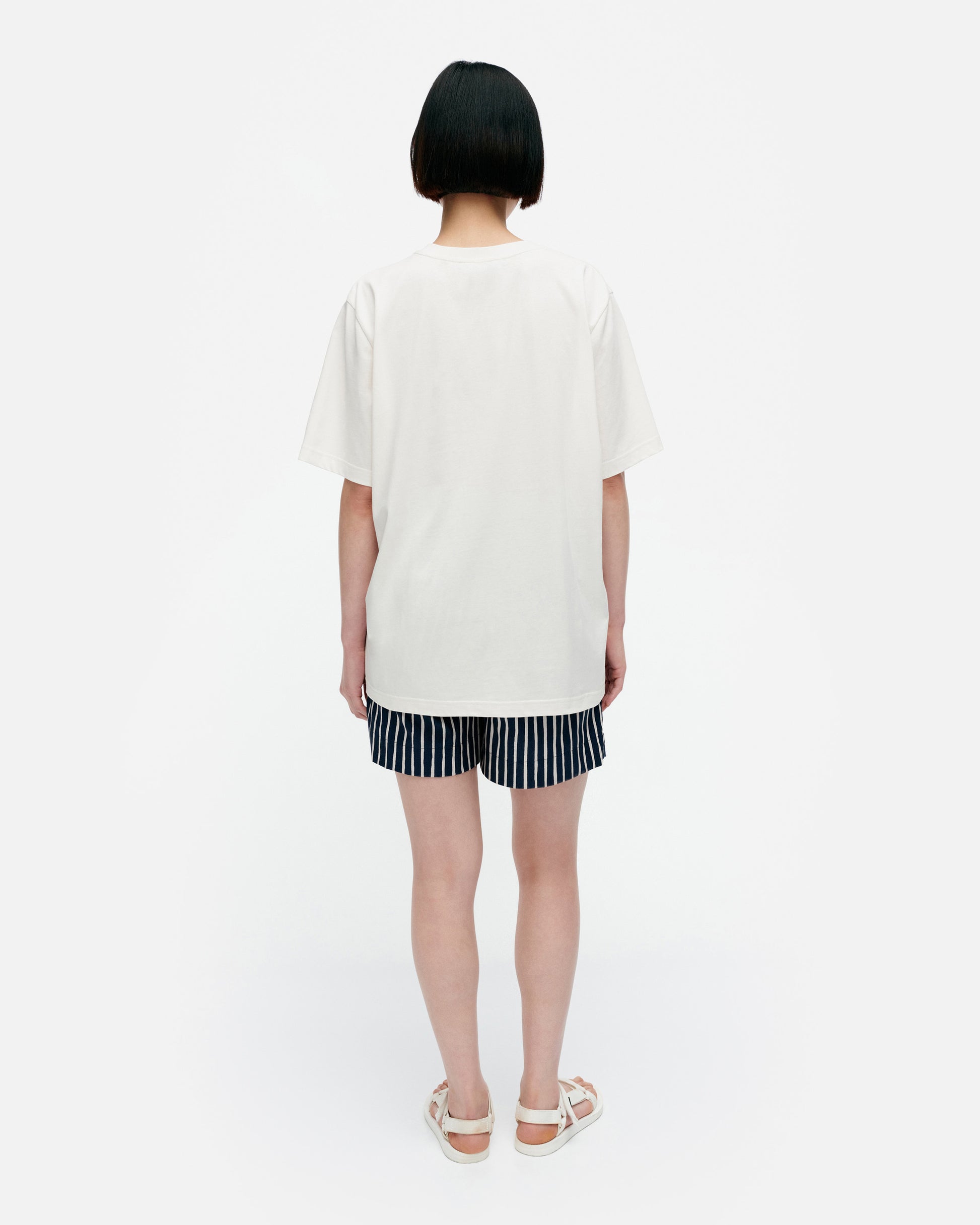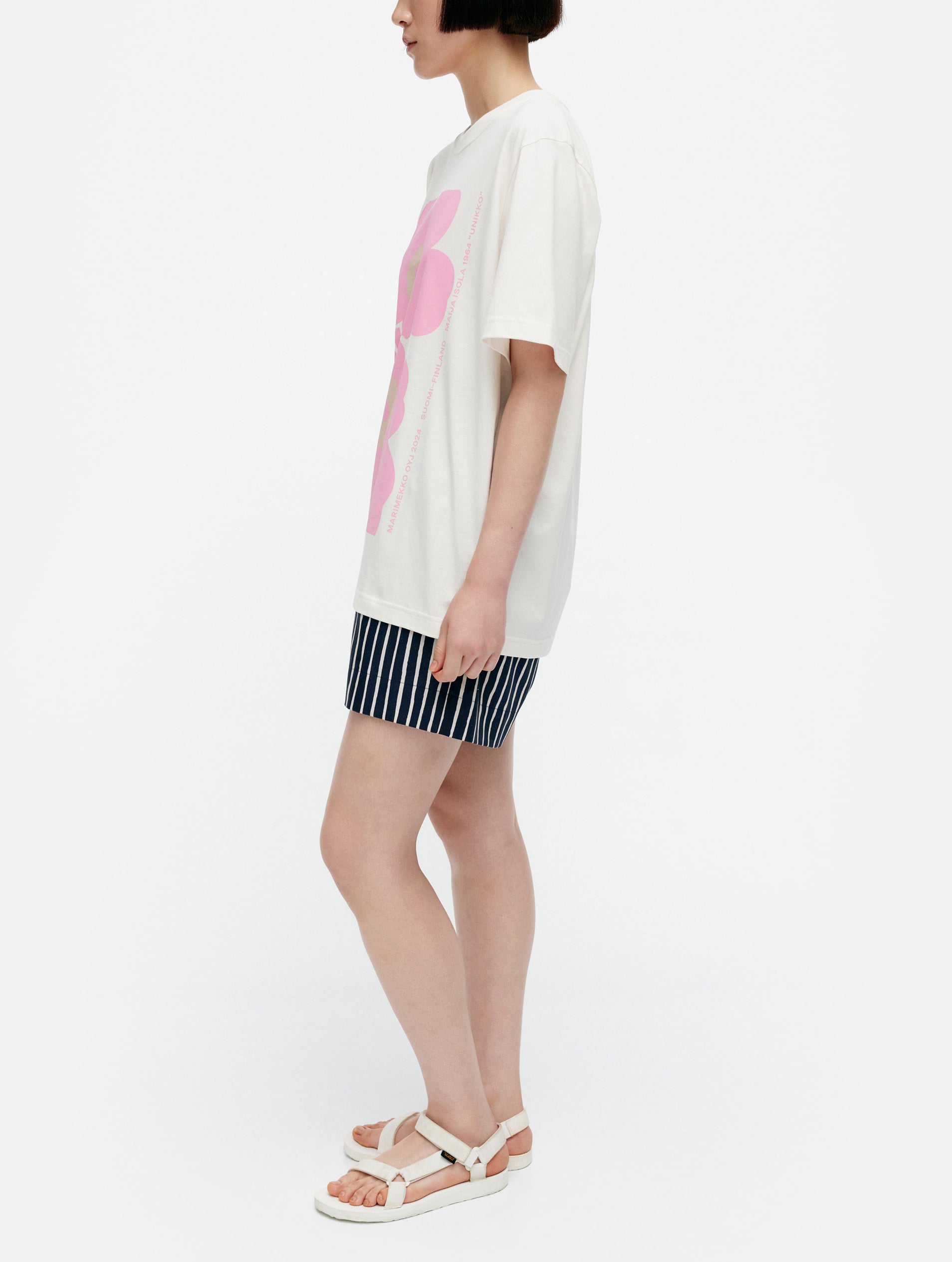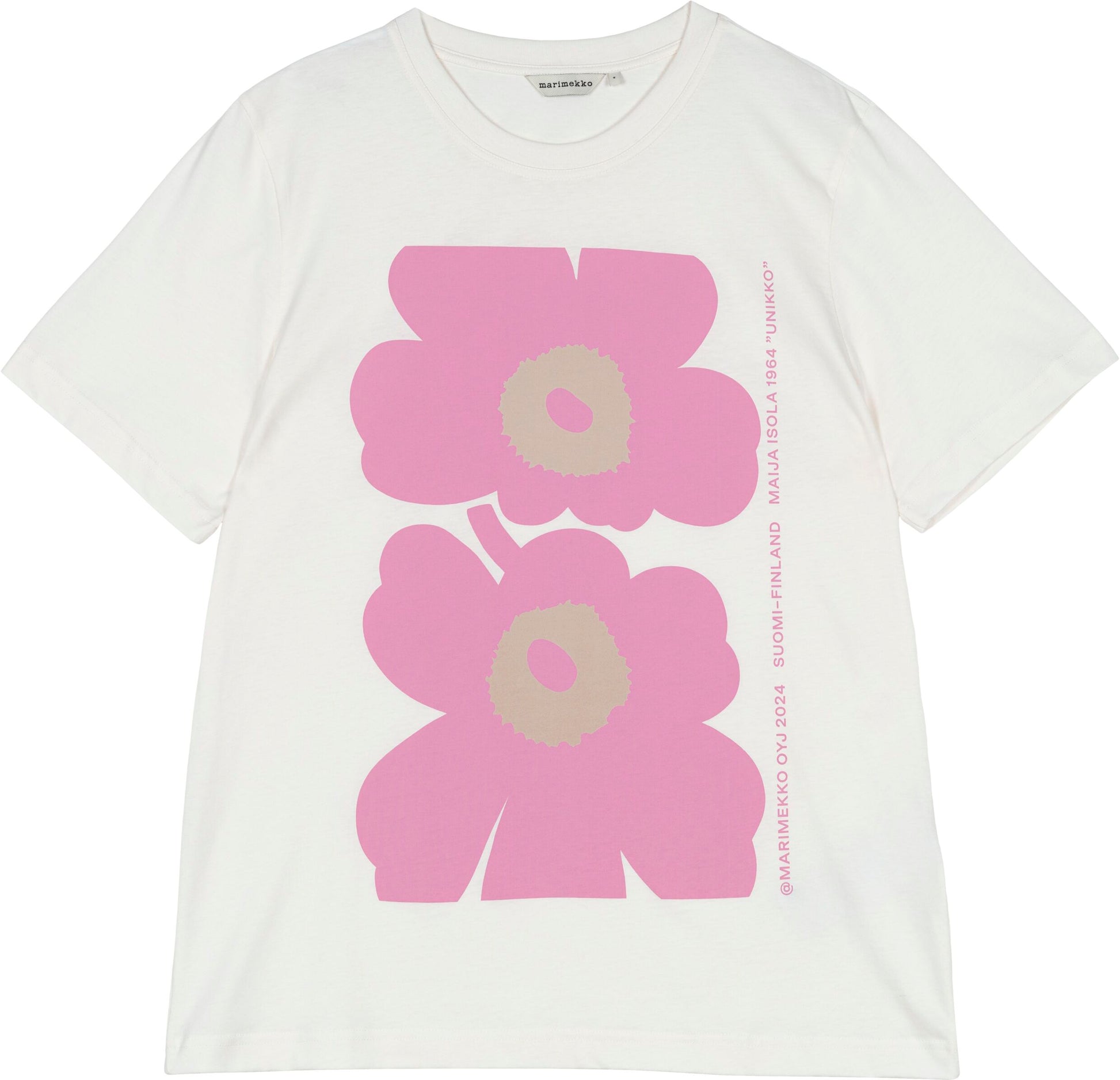 La t-shirt Embla ha un taglio maschile, è realizzata in jersey di cotone biologico e presenta la stampa Unikko con il testo stampato Marimekko nella parte anteriore. La t-shirt ha un girocollo a costine.