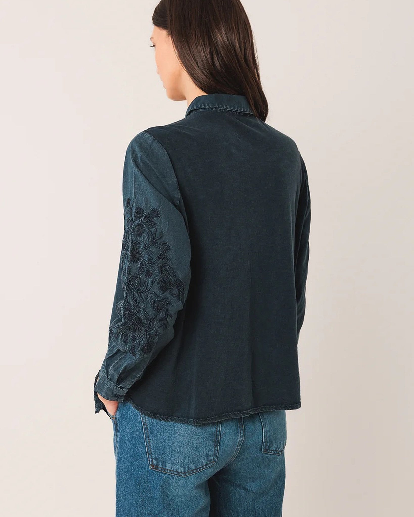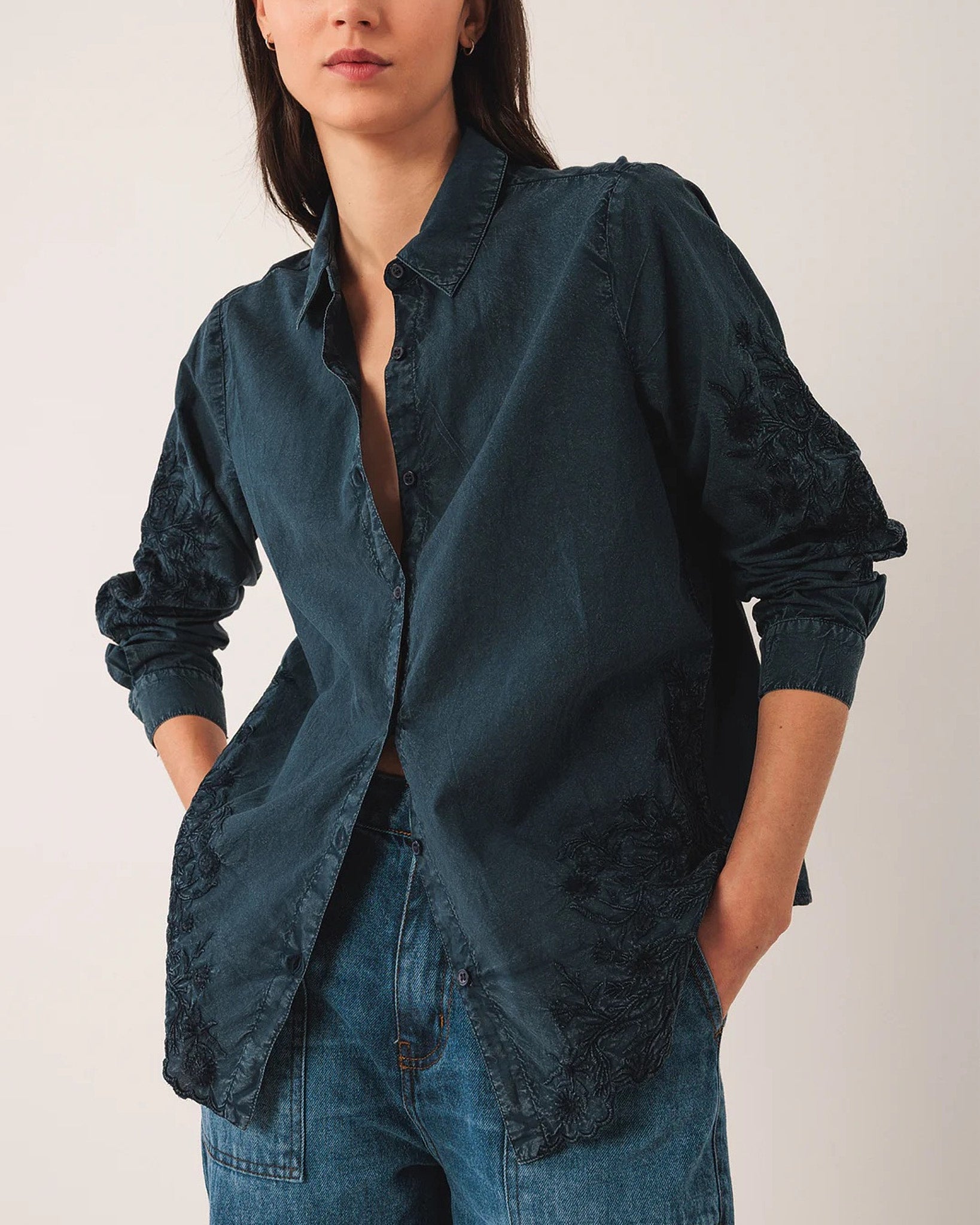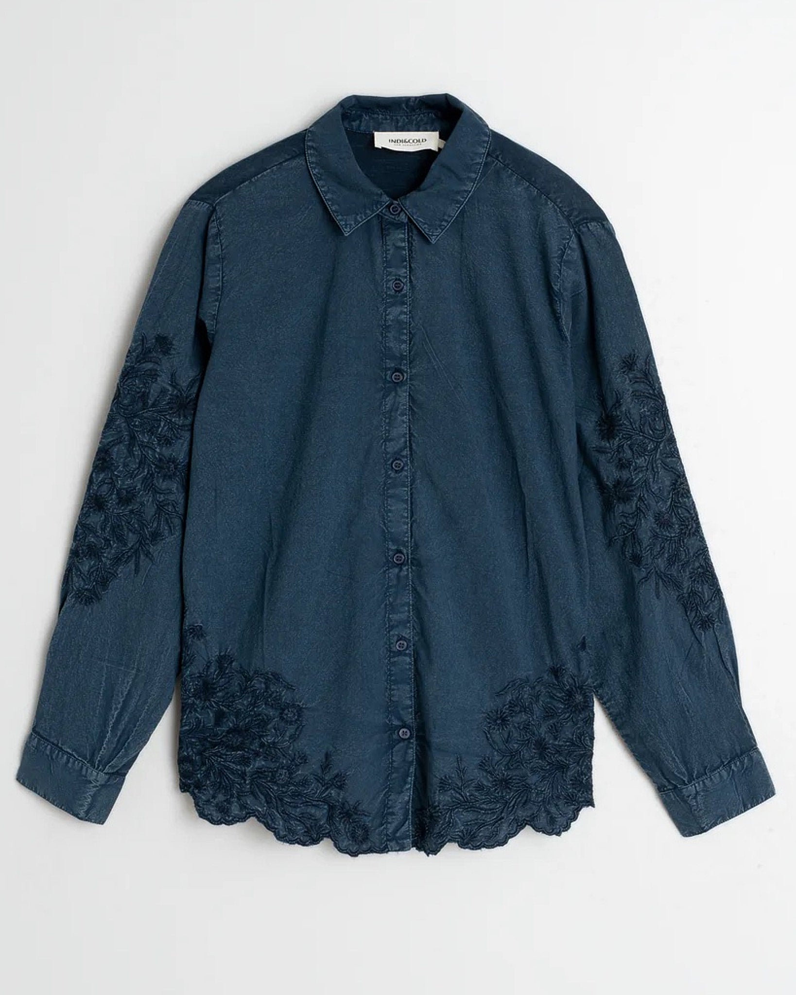 Una camicia in jersey slub e voile ricamato con motivo floreale con un mix tra casual e sofisticato. Vestibilità comoda e rilassata. Questo capo è stato tinto dopo la confezione, ottenendo leggere variazioni naturali di colore nelle aree più spesse come colletti, abbottonature e ricami.