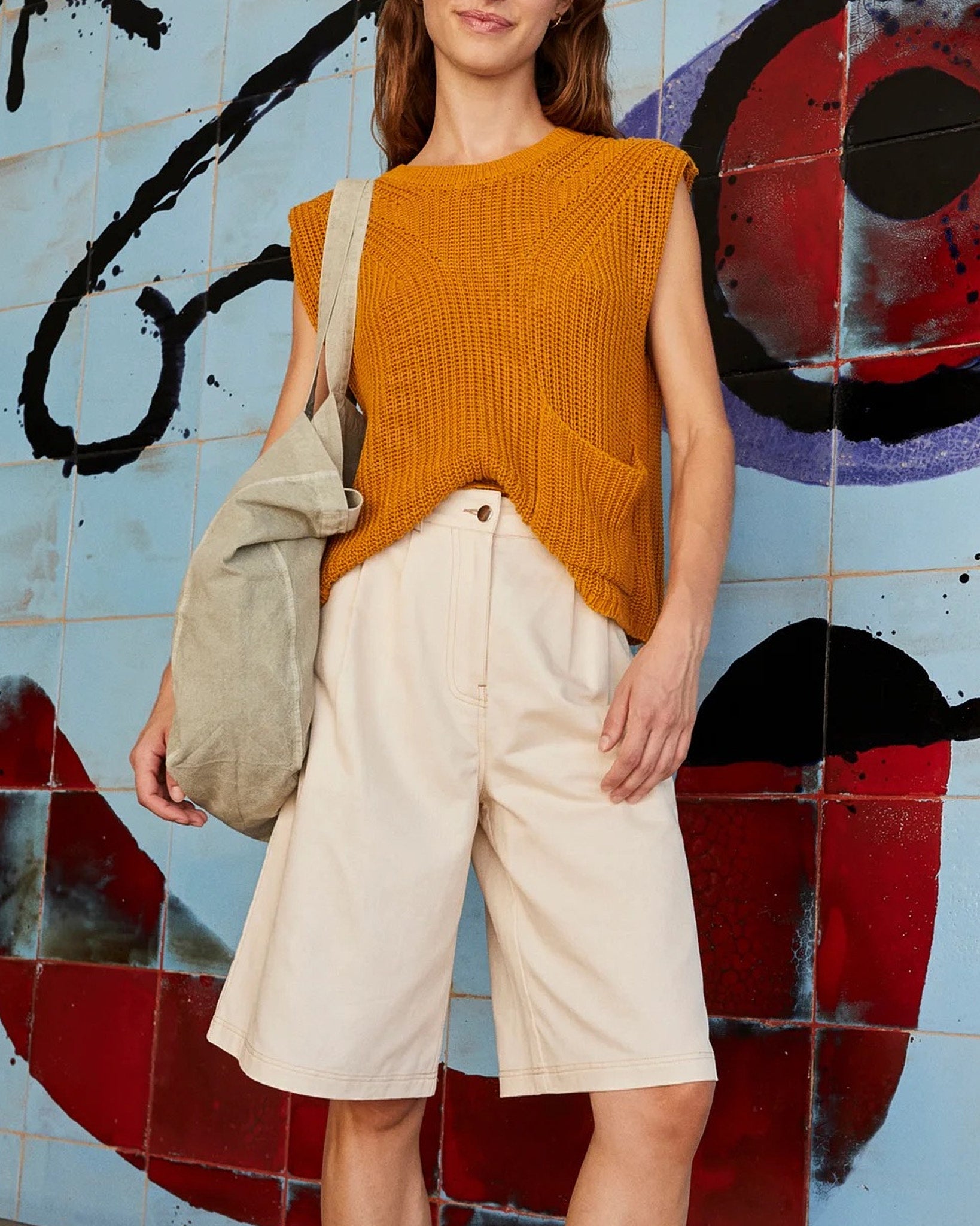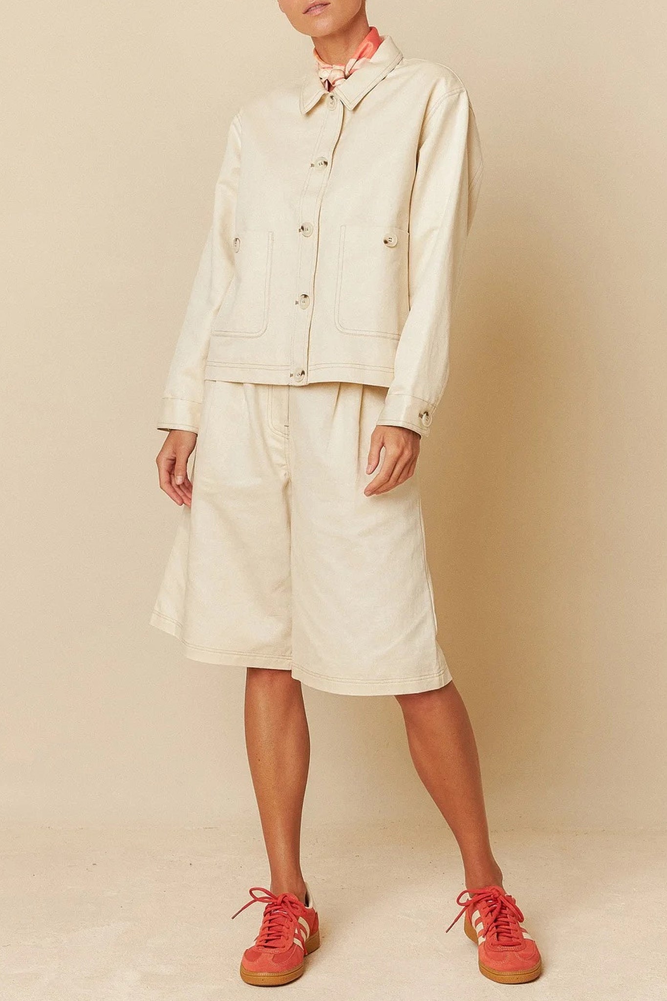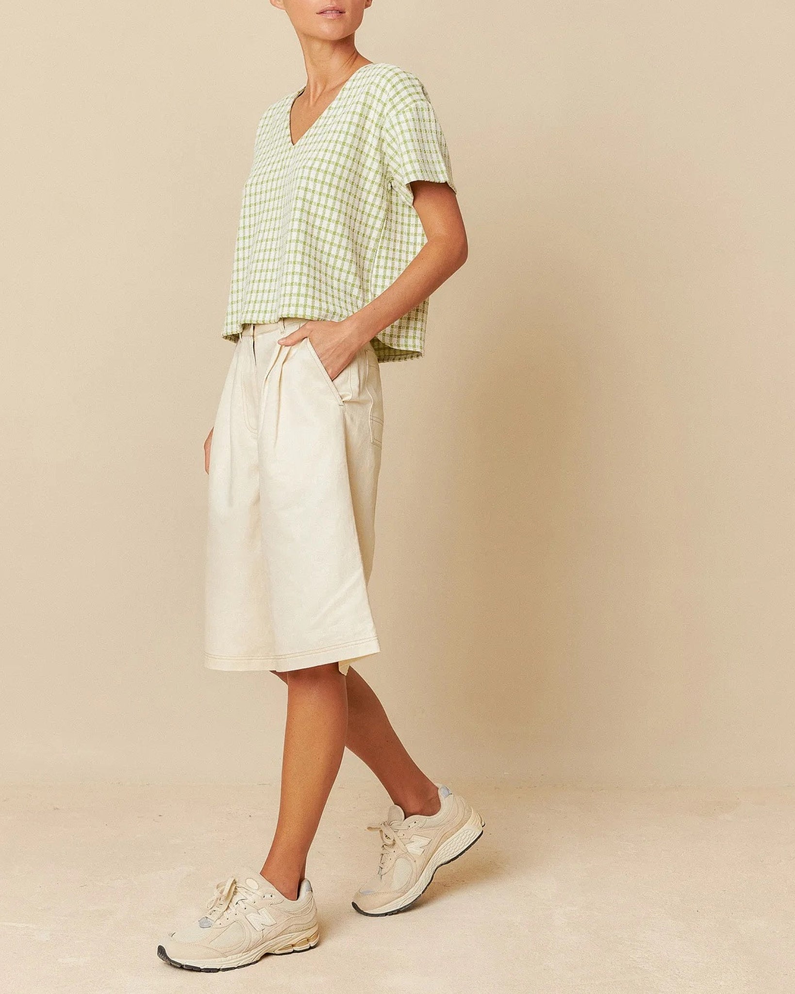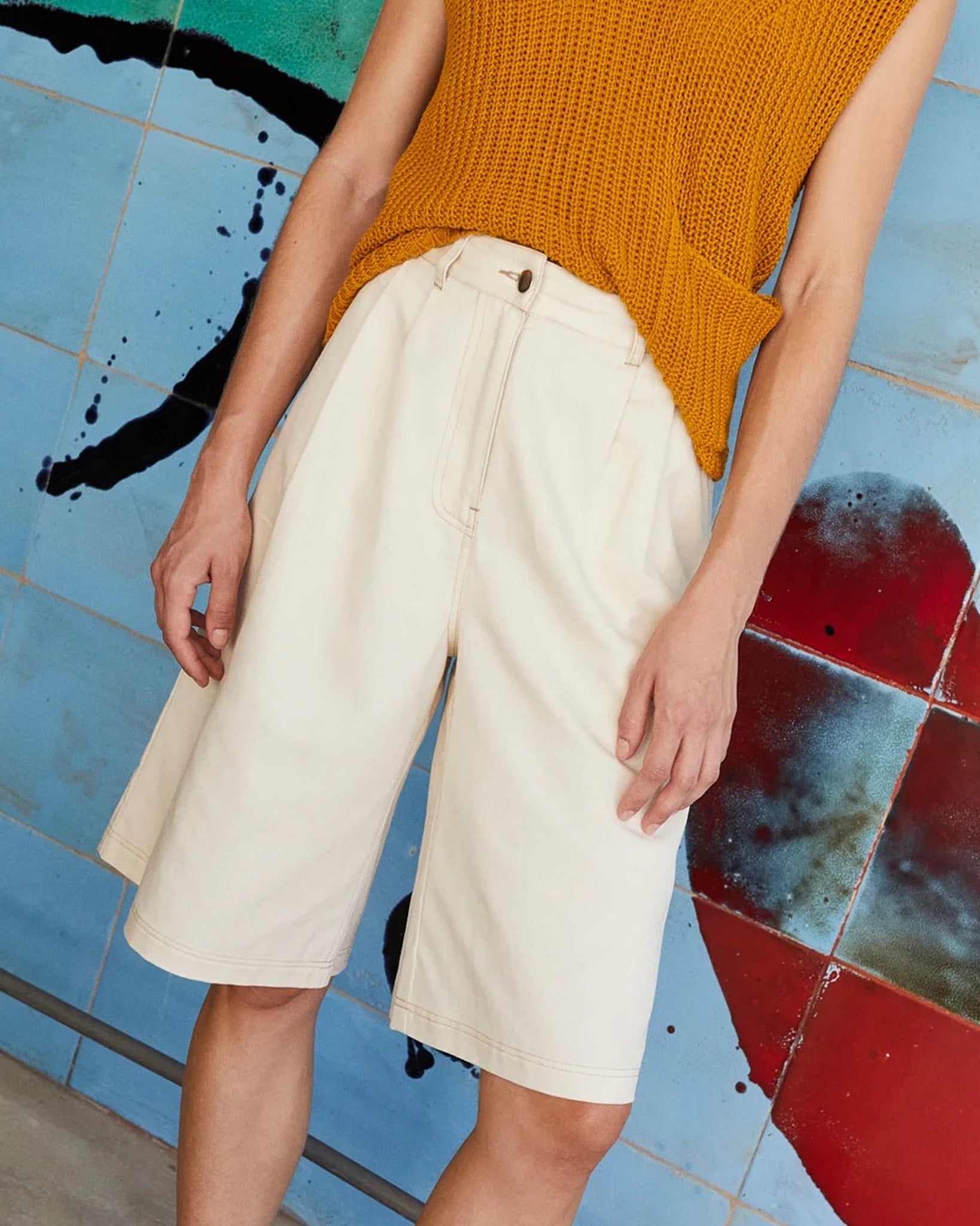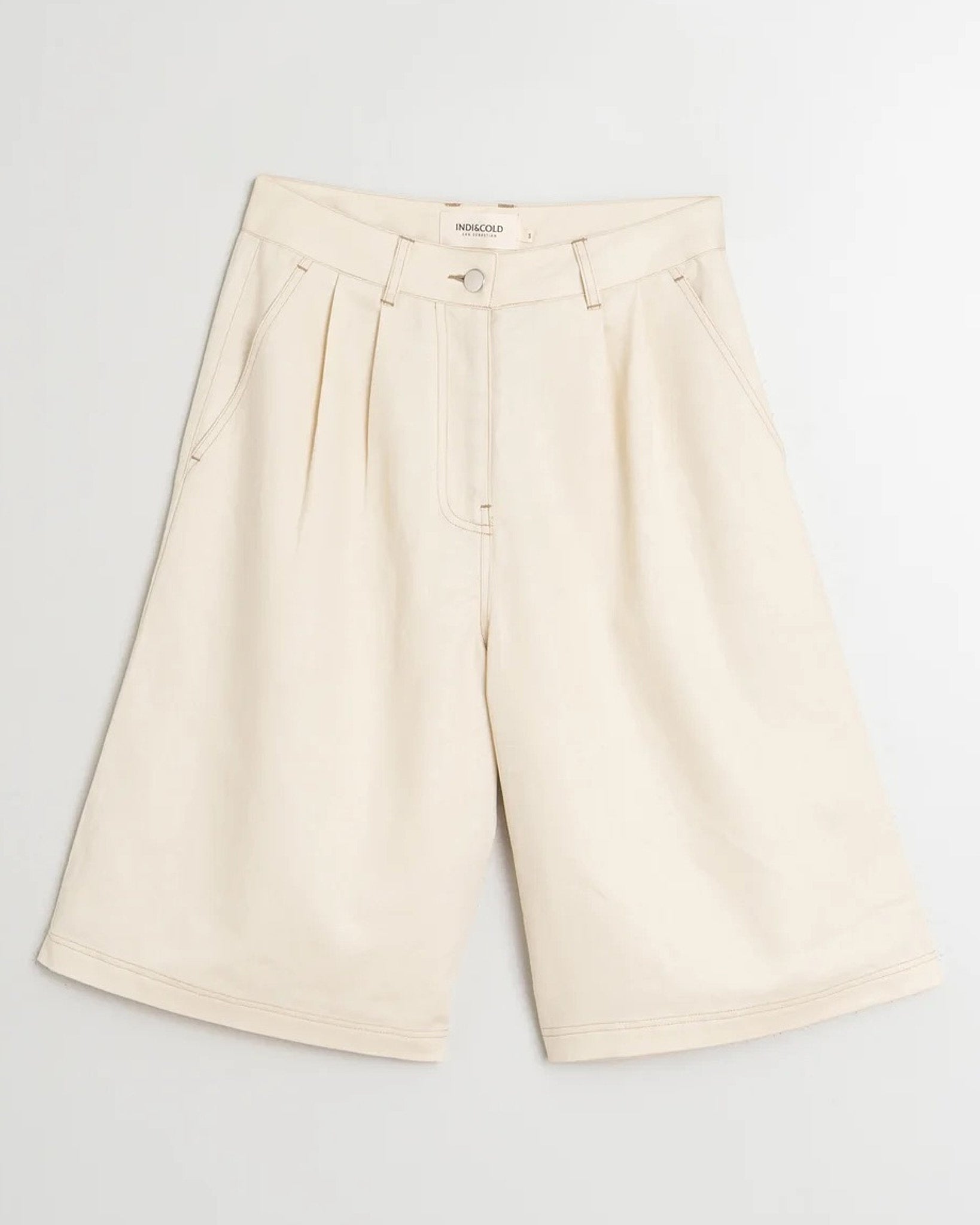 Bermuda a vita media, chiusura con zip e bottone e doppie pieghe anteriori.